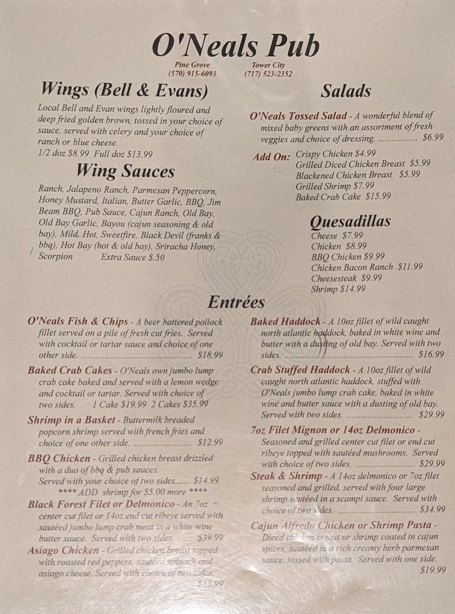 - Entrees: Indulge in favorites such as the iconic O'Neals Fish & Chips or the savory Baked Crab Cakes.